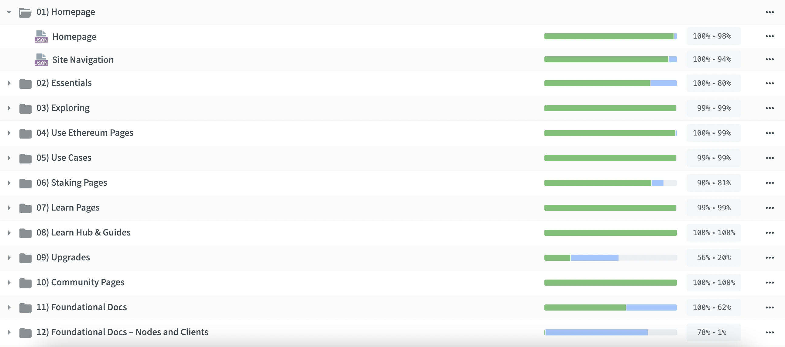 Once you've completed the translation (i.e. all files for a content bucket display 100%), our professional translation service will review (and potentially edit) the content. Once the review is complete (i.e. review progress is 100%), we will add it to the website.